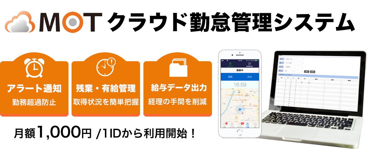 弊社でもスマホやPCで簡単管理が出来る勤怠管理システム『MOTクラウド勤怠管理システム』を提供しています。