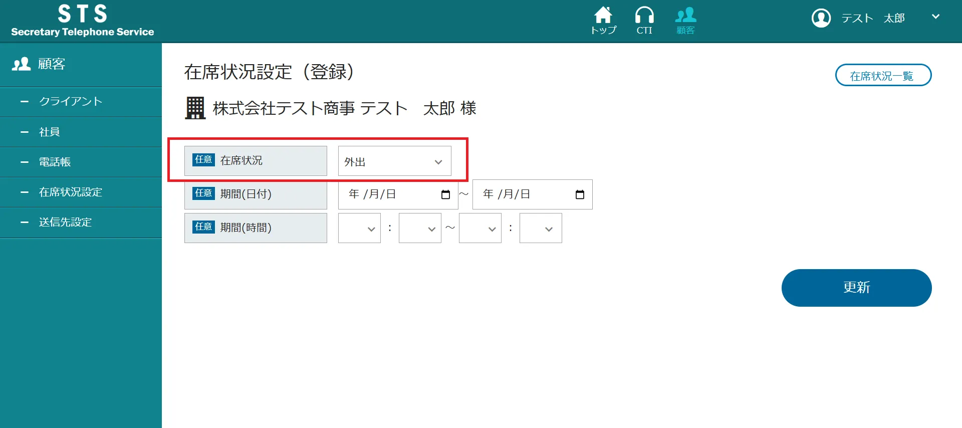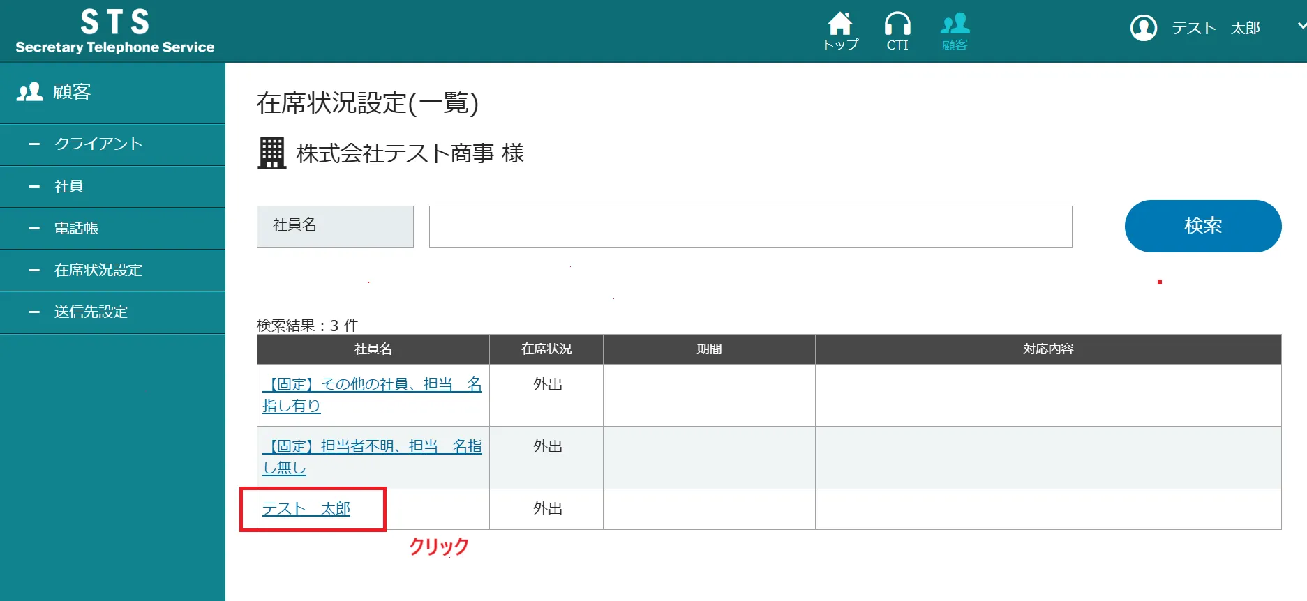 ステータス(在籍状況)を変更することで該当従業員の状況が一目で確認。ステータスが在籍であればそのまま内線にて取り次ぎ、その他はそれに応じた対応を行います。