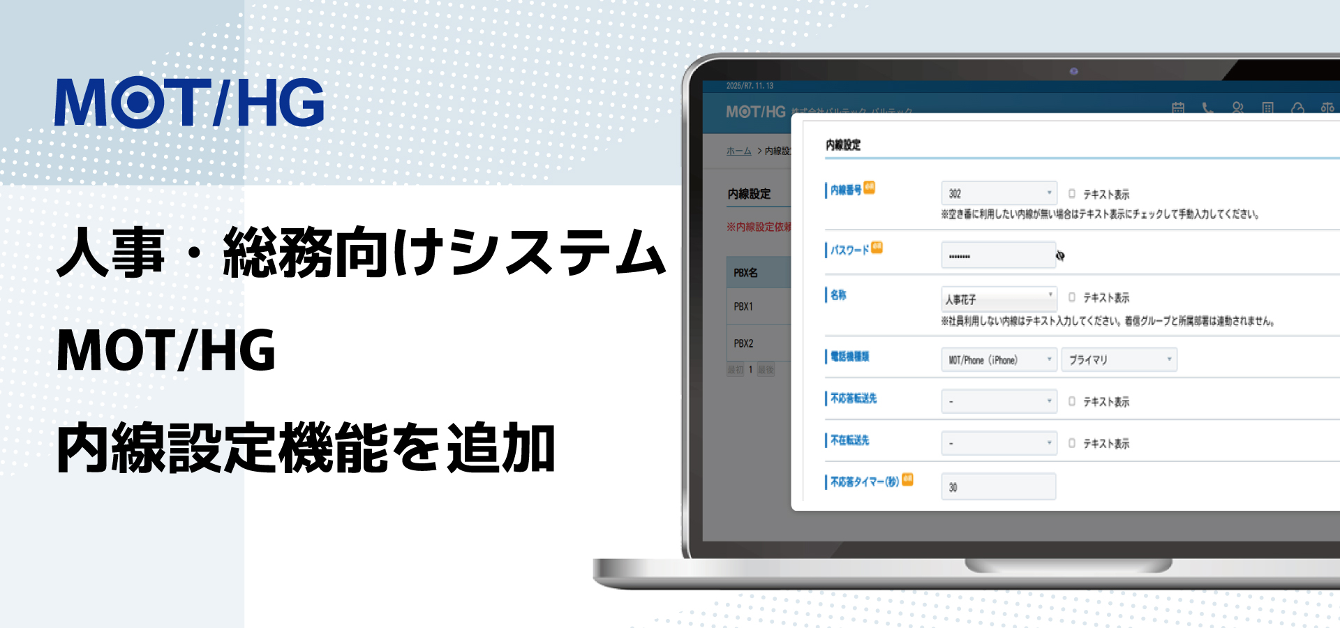 株式会社バルテック(本社:東京都新宿区)は、人事・総務向けシステム 「MOT/HG(モット・エイチジー)」をバージョンアップし、クラウド電話「MOT/TEL(モッテル)」の内線設定を自社で行える機能を新たに追加いたしました。