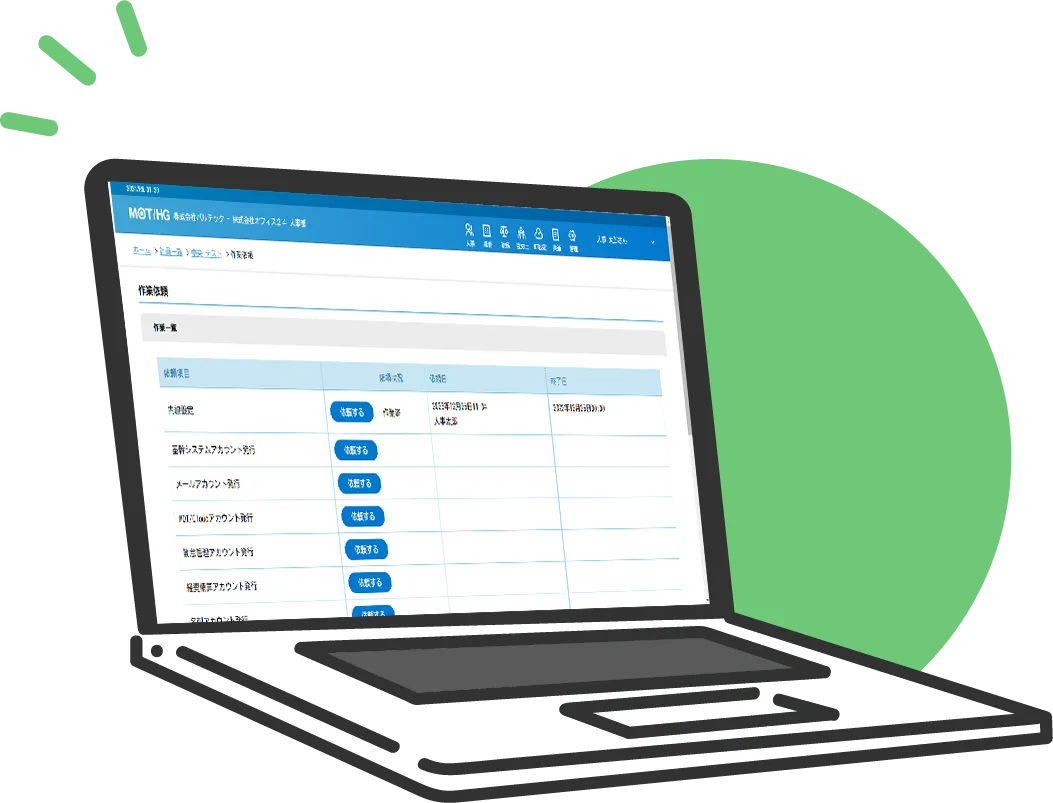 法人向け電話サービス「MOT/PBX」 と合わせて利用できる人事・総務向けシステム「MOT/HG」の管理画面上で、内線番号の新規登録・編集・削除を自社内で実施できます。