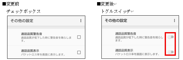 外部サービス設定、着信・発信動作設定、共通電話帳設定、表示設定など計40箇所以上の項目をトグルスイッチへと変更しました。