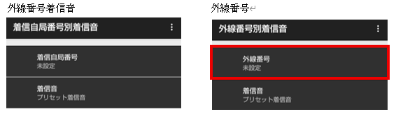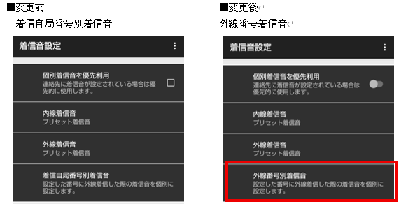 着信音設定にある名称で「着信自局番号別着信音」を「外線番号着信音」、「着信自局番号」を「外線番号」に変更いたしました。