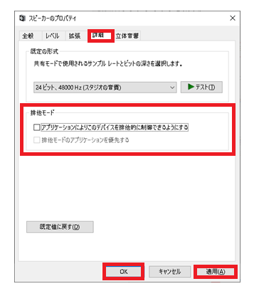6.次に「詳細」タブを開きます。《排他モード》項目の「アプリケーションによりこのデバイスを排他的に制御できるようにする」のチェックを外します。
